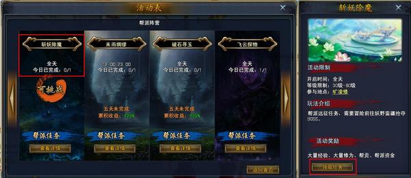 我们可以在游戏界面右上角的“活动”里找到这个任务(如图1-2),经验还是很可观的,可以说是每日必做的一个任务(我觉得我说了废话...),开放等级为30-80。每个等级段虽然执行的是同一个任务,但是诛杀对象不一样,本流程为40级的斩妖除魔任务。