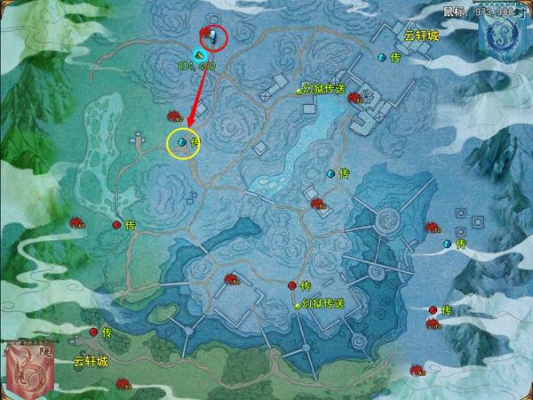 1.在地图红圈处为青穹羽仙的位置,而黄圈处为距离该地最近的传送门位置,所以现在我们先移动至黄圈处确认NPC摄天神将是否在此。